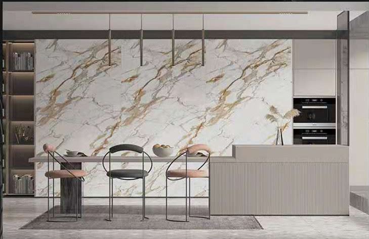 Taikymas | Calacatta auksinis porcelianas pasižymi atsparumu aukštai temperatūrai ir geru apsaugos nuo užsiteršimo poveikiu. Jis dažnai naudojamas bendram virtuvės ir vonios kambario dizainui |
